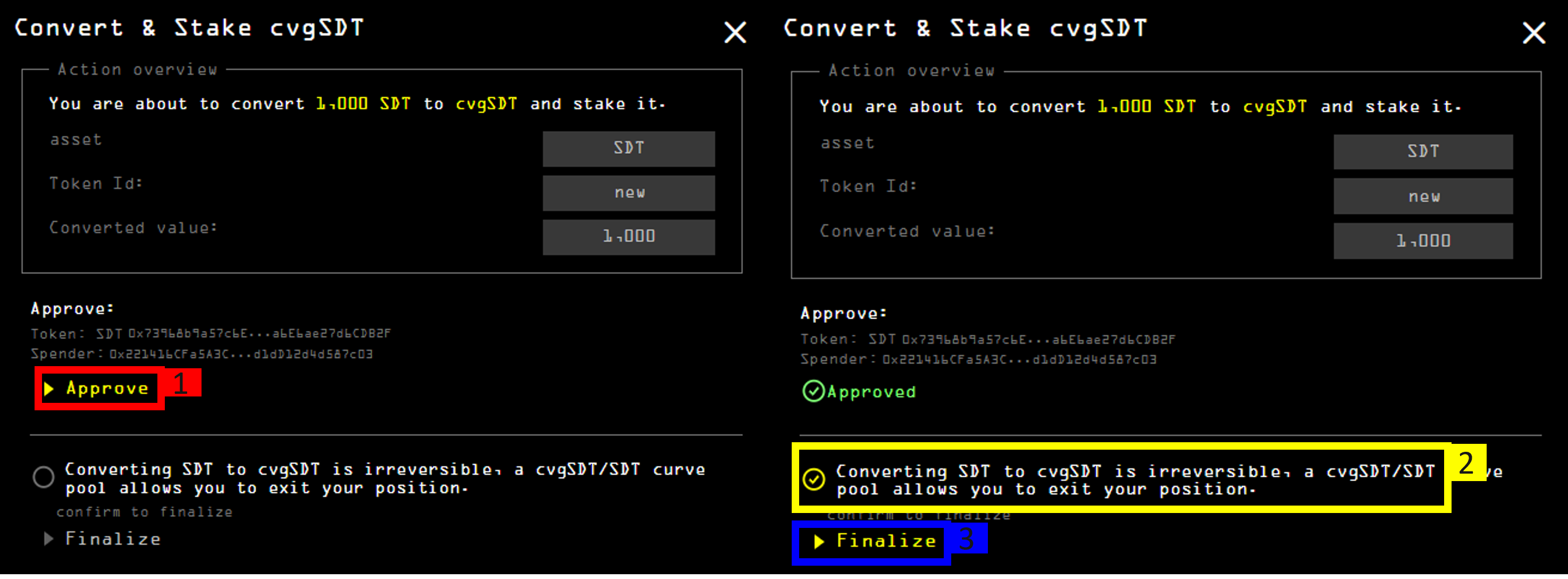1. Approve the contract's allowance in your wallet. The <mark style="color:yellow;">`Finalize`</mark> button will become available;